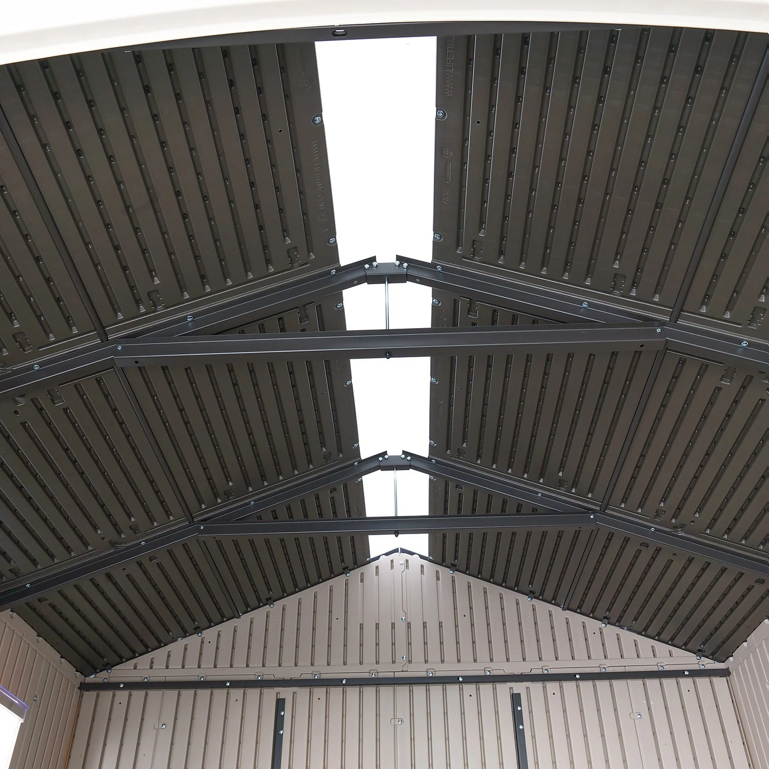 - Steep angle allows for quick drainage of rain and snow, and provides a spacious walk-around interior, heavy-duty steel trusses increase strength